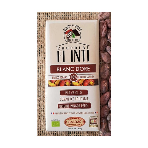 Bílá čokoláda 40 % kakaa, kakaové máslo vyrobené z bobů Coop. Pangoa Peru, celozrnný třtinový cukr z Peru (panela), plnotučné mléko, organické. Grand cru bílá, trochu béžová kvůli barvě celozrnného třtinového cukru, vynikající, velmi voňavá, s nádechem vanilky, aby vše chutnalo!