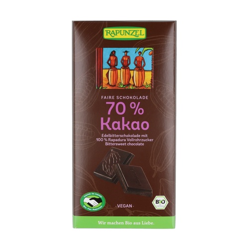 Extra hořká čokoládová tabulka 70 %. S třtinovým cukrem Rapadura a pravou vanilkou Bourbon. Vyrobeno podle švýcarské tradice s ingrediencemi z ekologického zemědělství a spravedlivého obchodu (Hand and Hand). Intenzivní konšování rozvíjí bohatost aroma kakaa a jeho jemnou texturu.