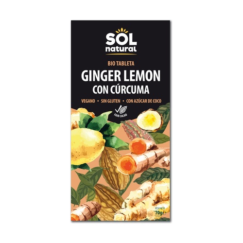 Veganská čokoláda se zázvorem, citronem a kurkumou Bio od Sol Natural je lahodná čokoládová tabulka s jedinečnou kombinací chutí spojující čokoládu se zázvorem, citronem a kurkumou.