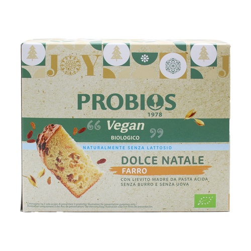 Pro ty, kteří si přejí slavit Vánoce s respektem k životu a životnímu prostředí, nabízí Probios širokou škálu veganských produktů v řadě GOvegan. Dolce Natale Vegan di Spelled je ekologický 100% rostlinný vánoční dort vyrobený z špaldové mouky a přírodního kvásku (s kváskem z MĚKKÉ PŠENICE). Zaručeně bez mléčných výrobků a vajec, je certifikován Vegan Society. Obsahuje rozinky a je oslazen agávovým sirupem.