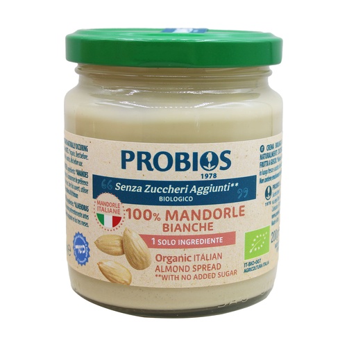 Bílý mandlový krém Probios, získaný výhradně mletím s jádrem italských mandlí.