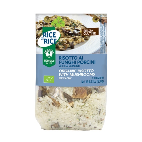 *rýže Carnaroli 92 %,*sušené hřiby Boletus edulis 3,2 %, mořská sůl, *rýžová mouka, *cibule, *celer, *mrkev, *petržel, *pórek, *extra panenský olivový olej,*česnek, *kukuřičný škrob, miso (*soja, *rýže, voda, sůl, koji Aspergillus oryzae), extrakt z kvasnic, *koření. *bio