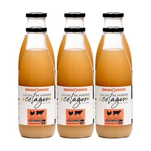 Všechny jeho složky jsou ekologické a vaří se pomalu po dobu 24 hodin, aby se získal kolagen a živiny, které tolik prospívají našemu tělu (kuřecí a hovězí kosti s ekologickou certifikací).
