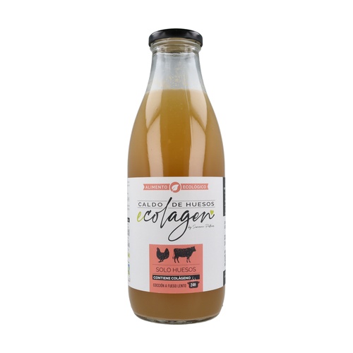 Všechny jeho ingredience jsou ekologické a vaří se na mírném ohni po dobu 24 hodin, aby se získal kolagen a živiny, které tolik prospívají našemu tělu (kuřecí a hovězí kosti s ekologickou certifikací).