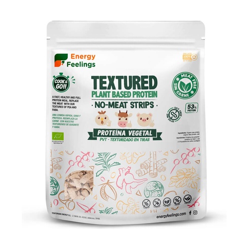 Texturovaný rostlinný protein ve formě proužků ne-masa z ekologické produkce od Energy Feelings má lahodnou mírně slanou chuť, která při ochucení připomíná maso. Fantastická alternativa k bílkovinám živočišného původu. Produkt s nízkým obsahem tuků, velmi nízkým glykemickým indexem. Zdroj bílkovin 53 %.