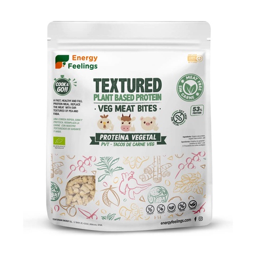 Texturovaná rostlinná bílkovina ve tvaru vegetariánských kousků masa ECO od Energy Feelings má lahodnou mírně slanou chuť, která po ochucení připomíná maso. Fantastická alternativa živočišným bílkovinám. Produkt s nízkým obsahem tuků, velmi nízkým glykemickým indexem. Zdroj bílkovin 53 %.