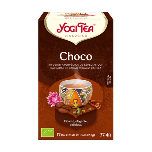 Choco od Yogi Tea je bylinný čaj z ájurvédských koření s kakaovou slupkou, lékořicí a skořicí, s nádhernou vůní čokolády z ekologicky kontrolovaného zemědělství.
