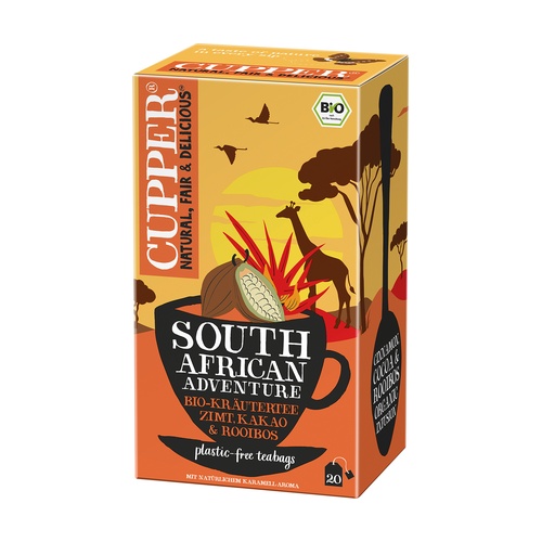 Infuze Afrika od Cupper. Naše bio čaje přinášejí chuť světa do vašeho šálku! Bio bylinný čaj s rooibosem a kakaovou slupkou a přírodní karamelovou příchutí