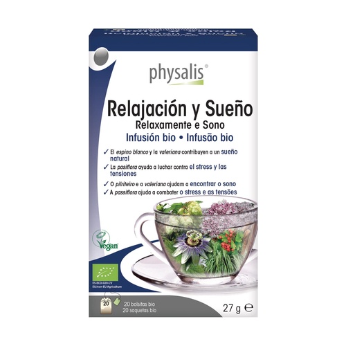 Relax a spánek Bio infuze od Physalis obsahuje kozlík lékařský, mučenku, hloh, meduňku,... Tyto rostliny pomáhají bojovat se stresem a napětím díky svému relaxačnímu účinku a přispívají tak k přirozenému spánku.