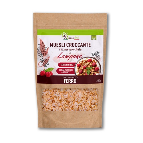 Bezlepkový müsli se sladkou ostřicí (Cyperus esculentus) a malinou. Ekologický.