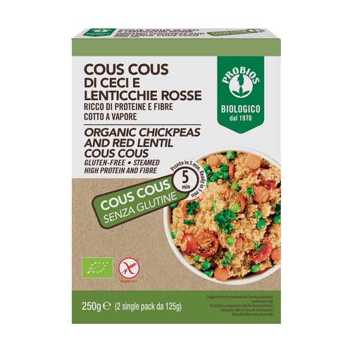 100% luštěninový kuskus s cizrnou a červenou čočkou od Probios je vyroben pouze z mouky z luštěnin: cizrna a červená čočka, pro nový a originální chuťový zážitek.