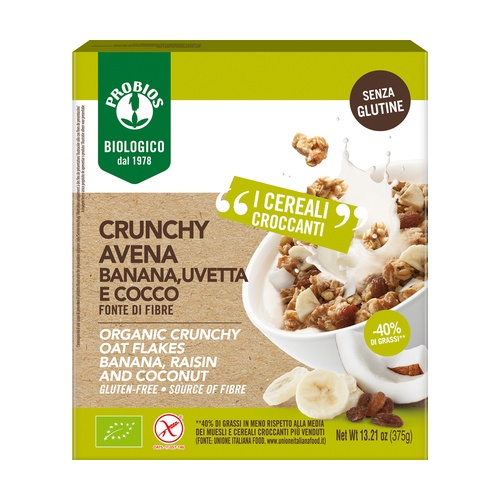 Bio crunchy oves s banánem, rozinkami a kokosem od Probios je ideální pro křupavou a chutnou snídani. Výrobek na bázi bezlepkového ovsa a bez palmového oleje.