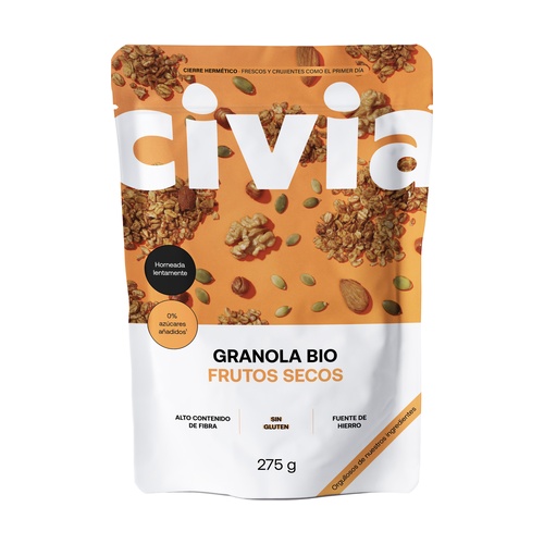 Bio ořechová granola od Civia. Lahodná křupavá směs ovesných vloček s mandlemi, lískovými oříšky, vlašskými ořechy a dýňovými semínky. Je vynikajícím zdrojem energie a rostlinných bílkovin, které pomáhají pečovat o vás.