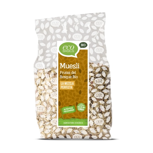 Hrubé vločky z ovesných zrn* 40 %, vločky z pšeničných zrn 25 %, vločky z ječmenných zrn* 25 %, rozinky sultánky* 3 % (s olejem ze slunečnicových* semen), lesní plody* 5 % (sušená černá ostružina*, sušená brusinka*, lyofilizovaná jahoda*), sušené nakrájené jablko* 2 %. *=z ekologického zemědělství.