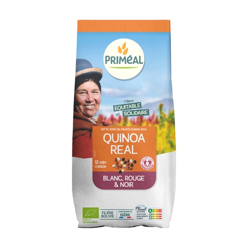 Quinoa Trio od Priméal je kombinace různých druhů quinoi: bílé, červené a černé. Semeno z čeledi Chenopodiaceae (jako špenát), považované za obilovinu díky svému nutričnímu složení. Quinoa je velmi vyváženým zdrojem bílkovin. Je zdrojem vlákniny.