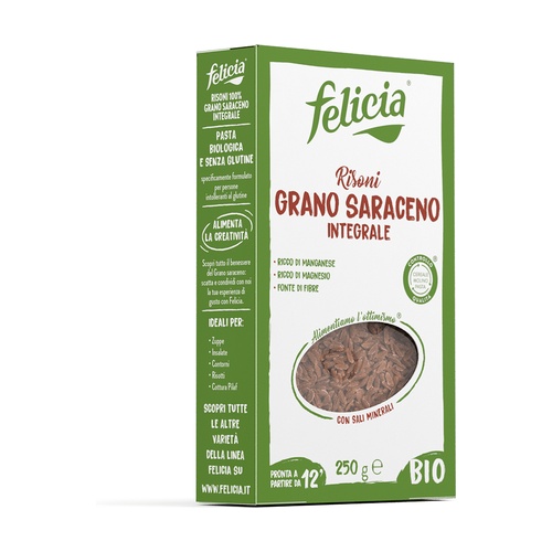 100% celozrnná pohanka Felicia je malé zrnko těstovin s vynikající chutí a nutričními přínosy: zdroj vlákniny, bohatá na minerály, hořčík a mangan.