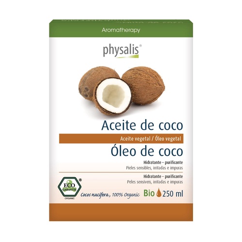 Bio kokosový olej Physalis je průhledný olej s příjemnou vůní kokosu, získaný lisováním bílé dužiny (kopry) plodu kokosovníku.