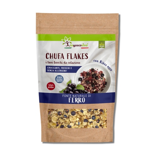Vločky sladké ostřice (Cyperus esculentus) a lyofilizovaný černý rybíz. Ekologické.
