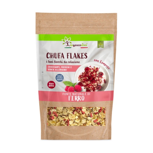 Vločky sladké ostřice (Cyperus Esculentus) a lyofilizovaná malina. Ekologické.