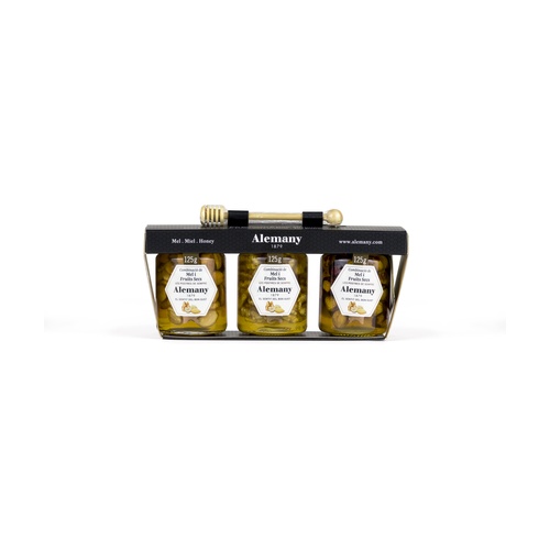 Balení 3 řemeslných medů s ořechy od Alemany zahrnuje med s mandlemi, med s lískovými ořechy a med s vlašskými ořechy.
