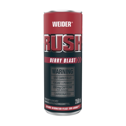 Rush rtd je jedinečný a inovativní energetický komplex aktivních složek ve formě nápoje, vyvinutý společností Weider podle nejnovějších výzkumných poznatků. Připravený k pití kdykoliv, tento nápoj představuje příjemný a odlišný způsob, jak se energizovat a splnit požadavky. Rush rtd poskytuje kombinaci složek se dvěma hlavními cíli: Podpora koncentrace a výkonnosti během tréninku.
