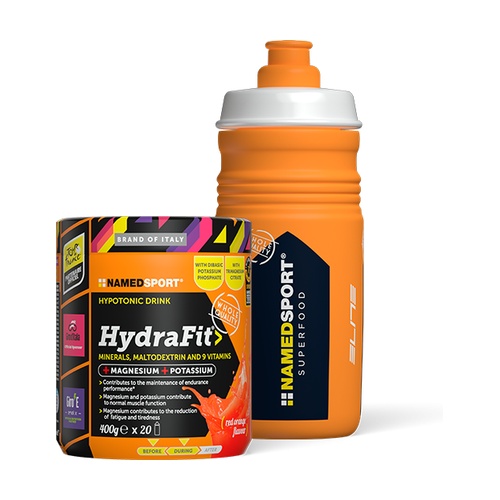 Hydrafit + sportovní láhev hydra2pro od Named Sport je exkluzivní směs minerálních solí, maltodextrinu a vitamínů, která byla speciálně vytvořena k přípravě hypotonického nápoje s elektrolyty. HydraFit je ideální řešení pro doplnění minerálních solí ztracených tělem v důsledku nadměrného pocení při intenzivním cvičení. Dodává se s láhví Hydra2pro, abyste si mohli připravit své nápoje.