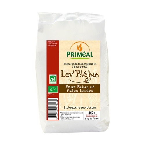 Priméal BIO Lev'blé je vyráběn výhradně z ingrediencí z ekologického zemědělství: pšenice a vybraných kvasnic. Tyto kvasnice ve spolupráci s pšeničným kváskem vyvinou během fermentace velmi příjemné chutě, ale vyžadují přizpůsobený čas kynutí.