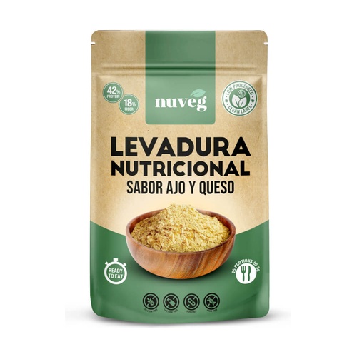 Nutriční droždí s příchutí česneku a sýra od Nuveg je skvělé superpotravinové obohacení nutriční hodnoty jakéhokoli pokrmu. Poskytuje lehce drožďovou chuť s bohatým profilem chuti pečeného česneku a parmezánu. Je zdrojem dietních vláknin (18 g) a bílkovin (42 g).