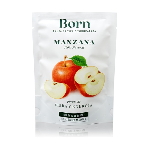 Polosušené jablko Eco od Born. S Born získáte všechny výhody ovoce: zdroj energie, bohaté na vlákninu a bez tuku. Jsou vybírána ta nejlepší jablka přirozeně dozrálá na stromě. Ovoce je ručně čištěno a loupáno, část vody je odstraněna pomocí exkluzivního procesu, čímž vzniká jedinečná textura a chuť.