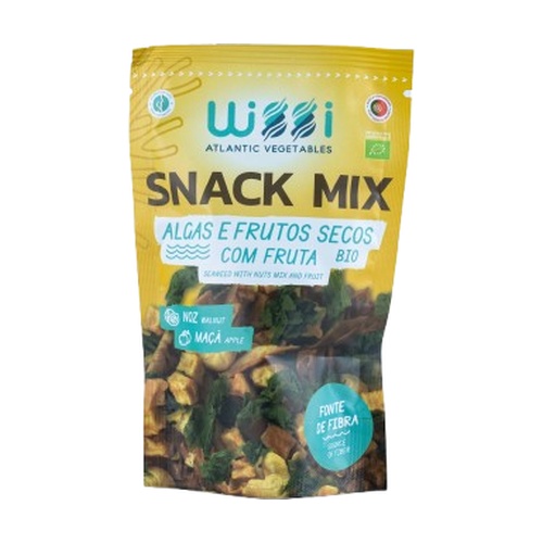 Snack Mix řasy a ořechy s bio jablkem od Wissi, z bio surovin, připravený ke konzumaci při jakémkoliv jídle nebo během dne a také jako doplněk při sportovních aktivitách.