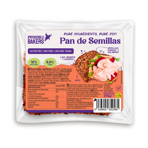 Impossible Bakers Semínkový chléb, tento úžasný chléb je ideální pro ty, kteří dodržují nízkosacharidové diety, celiaky a vegany. Se svou výživnou kombinací slunečnicových, lněných a dýňových semínek a vysokým obsahem vlákniny (9,6 %) si tento chléb získá vaše chuťové pohárky svou lahodnou chutí a texturou připomínající německý chléb. Cenné živiny, které poskytuje, jsou skvělým doplňkem pro udržení vyvážené a vlákniny bohaté stravy, přinášející nespočet benefitů pro vaše zdraví.