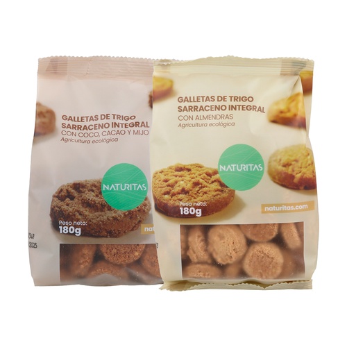 Balíček různých pohankových sušenek Naturitas Essentials se skládá ze dvou verzí; Bio celozrnné pohankové sušenky s kokosem, kakaem a prosem a Bio celozrnné pohankové sušenky s mandlemi.