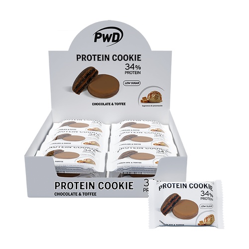 Proteinová sušenka 34 % - Čokoláda s toffeem od PWD jsou sušenky z mléčné čokolády plněné toffeem. Mají vysoký obsah bílkovin (34 %) a velmi nízký obsah cukrů (nepřesahuje 0,7 g na sušenku).
