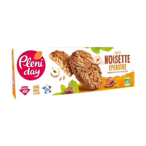 Celozrnná mouka z špaldové pšenice (původ Francie) (lepek) (21,5 %), mouka z pšenice t65 (původ Francie), deodorovaný řepkový olej, třtinový hnědý cukr, nasekané pražené lískové oříšky (9,9 %), vločky z pšenice, vločky z žitné mouky (lepek), nafouklá rýže (rýžová mouka *), akáciová vláknina, uhličitany amonné a sodné, mořská sůl.